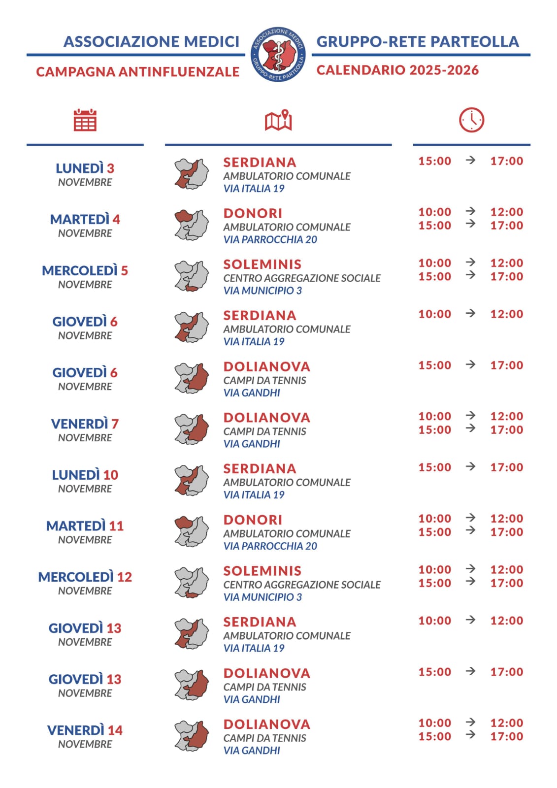 Comunichiamo alle persone interessate che il Comune di Donori, in collaborazione con l'ASSOCIAZIONE MEDICI GRUPPO-RETE DEL PARTEOLLA E LA ASL DISTETTO 3 QUARTU-PARTEOLLA e le Associazioni di Volontariato locali, a partire dal 3 novembre 2025, inizieranno la campagna di somministrazione dei vaccini secondo il calendario allegato.
